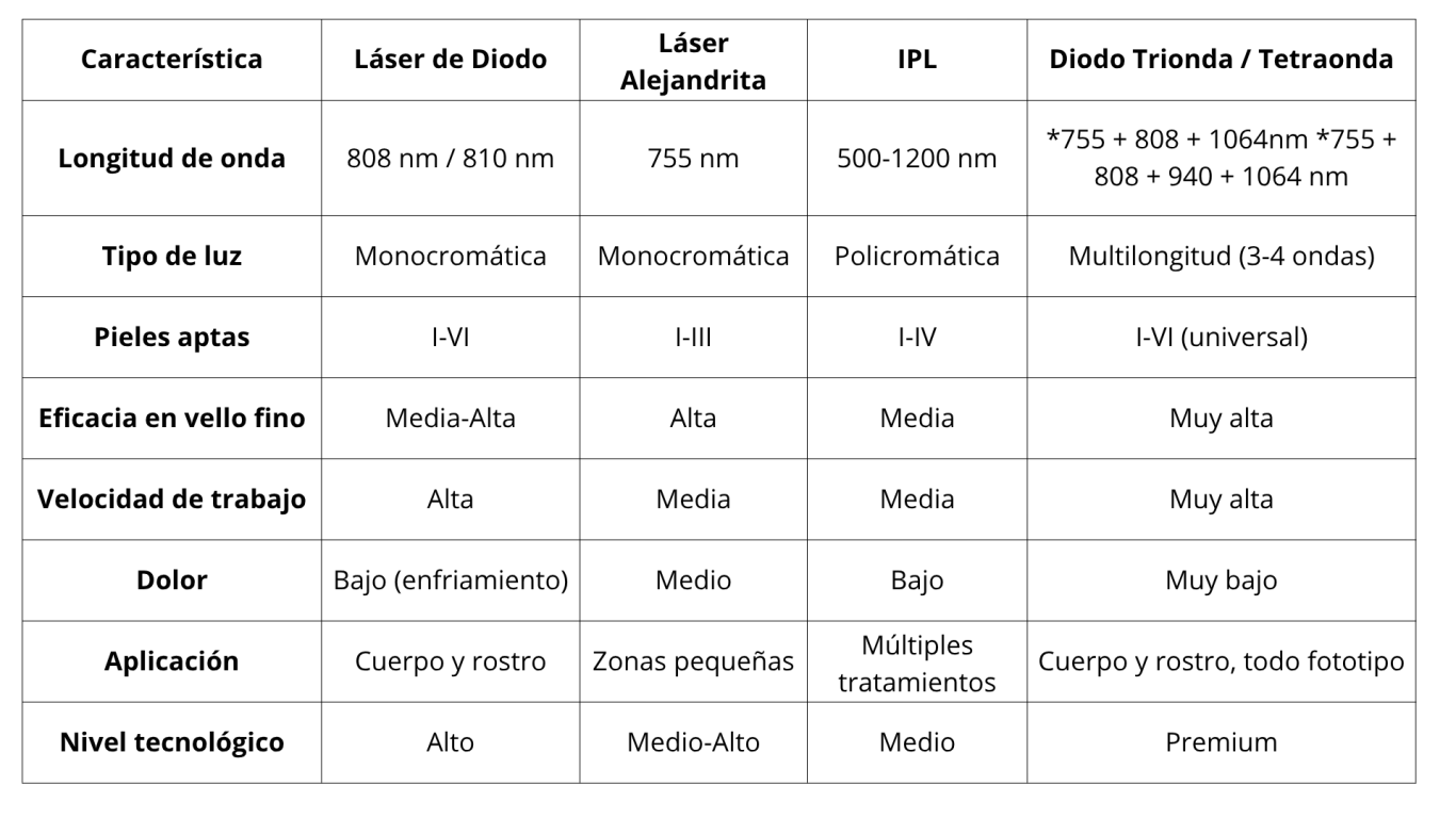 👉 En conclusión: los sistemas de diodo multionda (Trionda/Tetraonda) son hoy la tecnología más avanzada y eficaz del mercado para la fotodepilación profesional.
