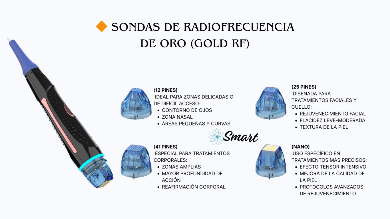 El corazón de la eficacia del Smart RF Fraccionada Duo reside en la calidad de sus consumibles. El uso de microagujas chapadas en oro de 24K no es una elección estética, sino una necesidad técnica para tratamientos de alto rendimiento: