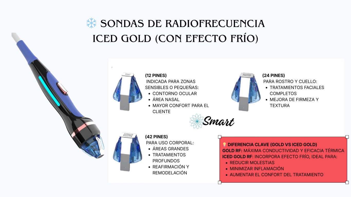 Conductividad Térmica Superior: El oro es uno de los mejores conductores de energía. Esto permite que la Radiofrecuencia se entregue de manera uniforme y precisa en el tejido diana, evitando puntos calientes que podrían causar quemaduras o resultados irregulares.